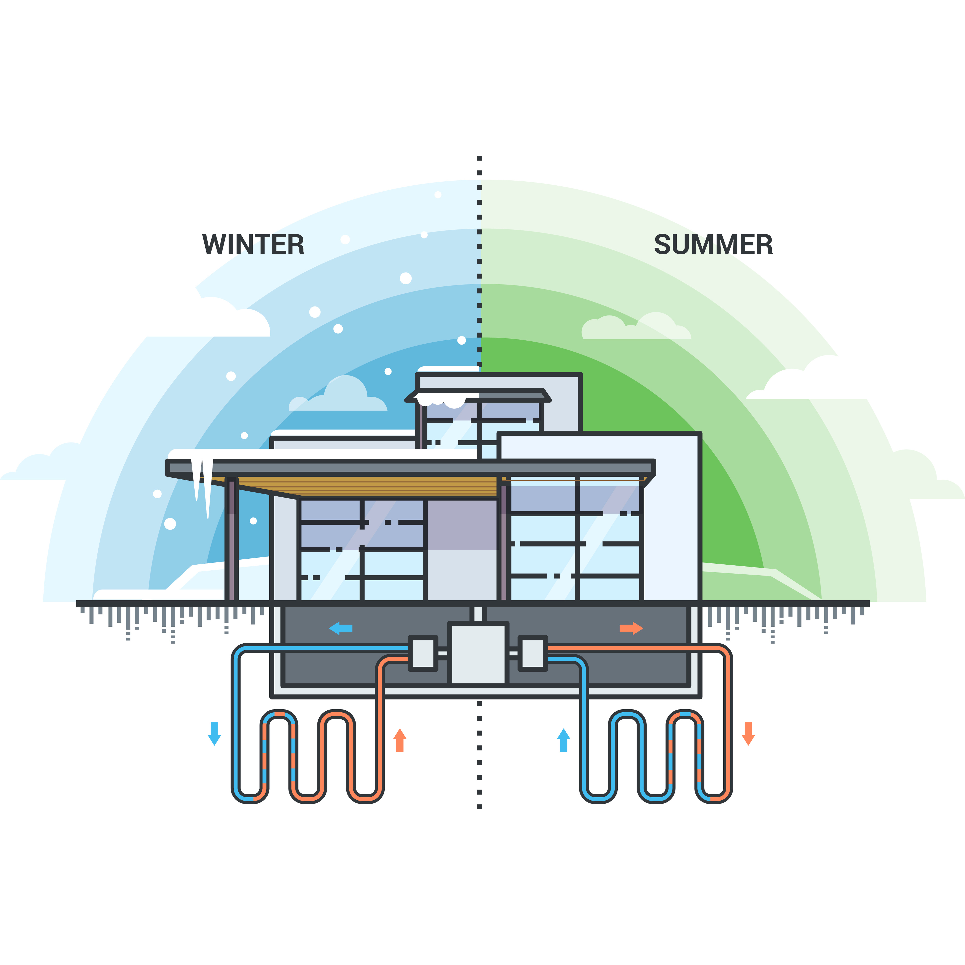 There are also geothermal or ground source heat pumps. These use the relatively stable temperatures of the ground just below the surface for heat transfer, absorbing heat from the ground in the winter and moving it indoors to warm the building. In the summer, it releases heat from the building into the ground effectively cooling the building. These typically require installation of coils in the earth that are necessary for the heat transfer.